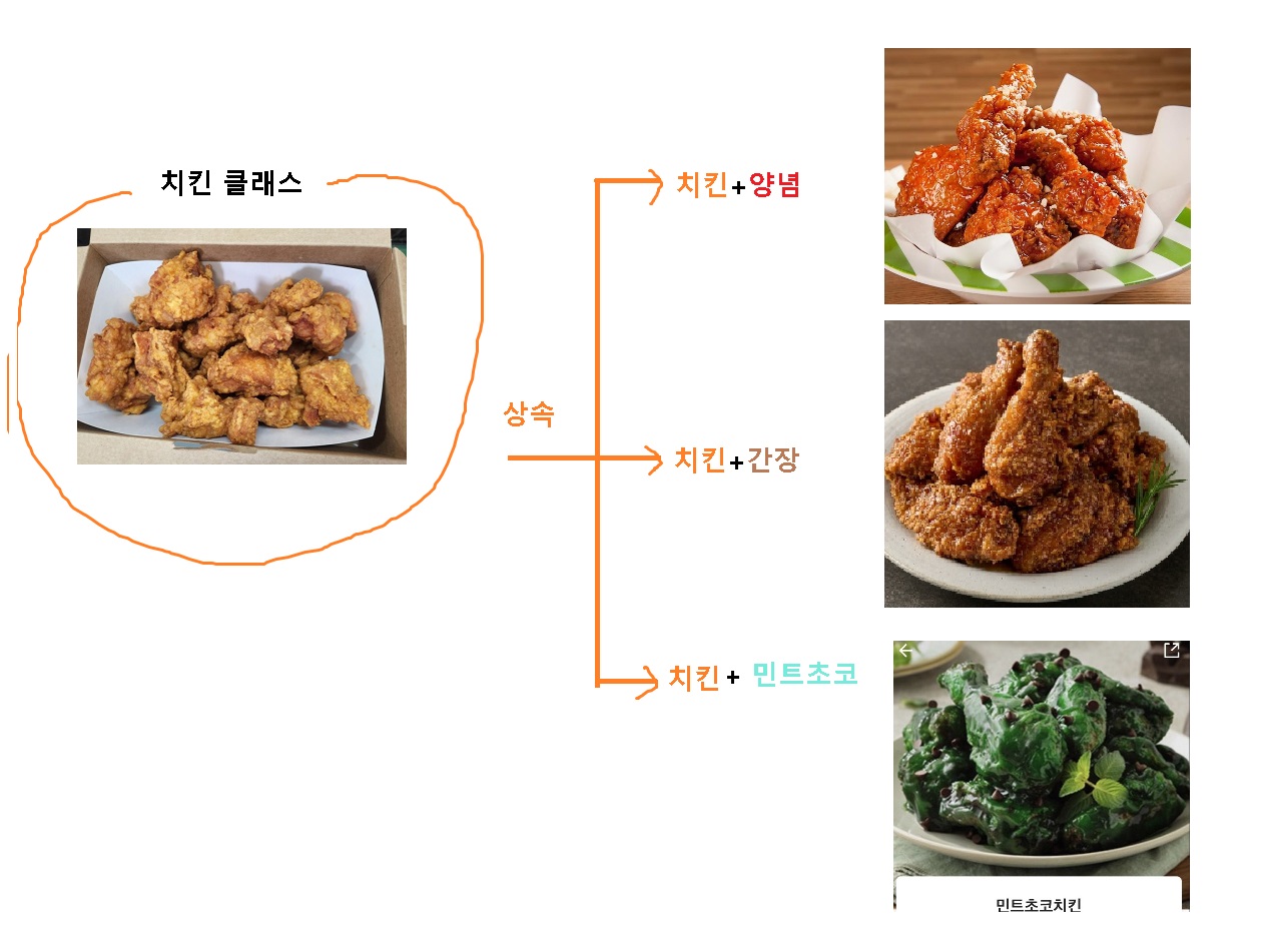 기존의 '치킨'의 정의에다가 추가되는 부분만 수정하면 새롭게 "양념 치킨" 이라는 개념(클래스)를 만들어 낼 수 있는 것이다.