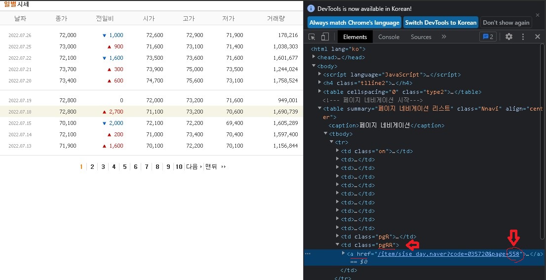 오늘의 목표인 일별시세 데이터는 위의 웹페이지 아래쪽에서 확인 할 수 있었다.
