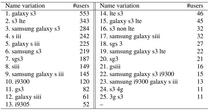 - 브랜드명(회사)과 모델명이 같이 있는 경우 only모델명도 포함 ex) Samsung Galaxy s3, Galaxy s3