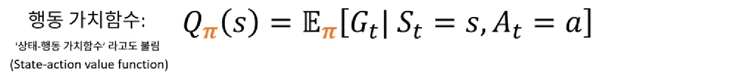 - 어떤 상태에서 특정 행동을 취하고, 정책(π)을 따랐을 때 얻어질 것으로 기대되는 가치의 총합