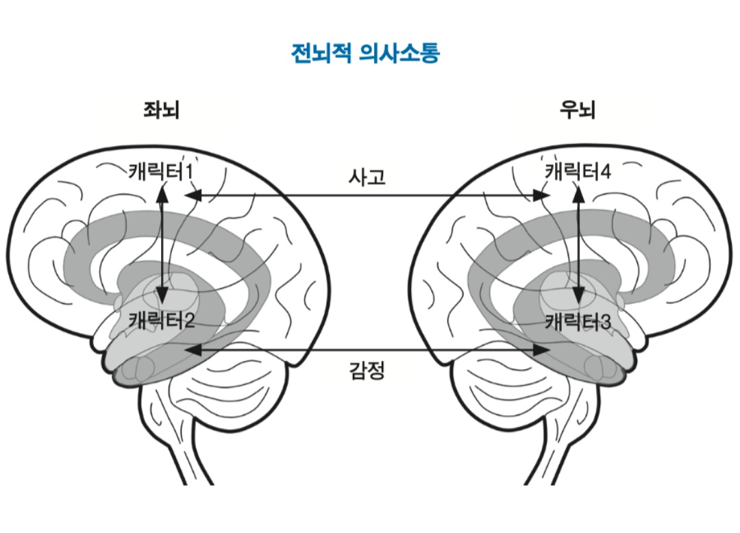 그것을 필자는 '두뇌 회담'이라고 하는데, 어떤 하나의 자아가 너무 강해졌을 때 우리는 다른 자아들이 있다는 사실을 알고 있는 것만으로도 큰 힘을 얻게 된다. 이러한 두뇌회담은 우선 90초의 화학작용이 끝나고 정지 버튼을 누른 상태에서 진행된다. 이후 4가지 케릭터가 모두 자신의 의견을 내도록 독려하고, 각 케릭터들의 의견을 조율하여 만장일치로 합의에 도달한다. 이러한 두뇌 회담은 평소에 바쁜일이 없을 때 연습을 해두는 것이 좋다. 그렇게 된다면 내 모든 뇌의 역량을 활용한 '전뇌적 삶'을 살아가는데 큰 도움이 될 것이다.