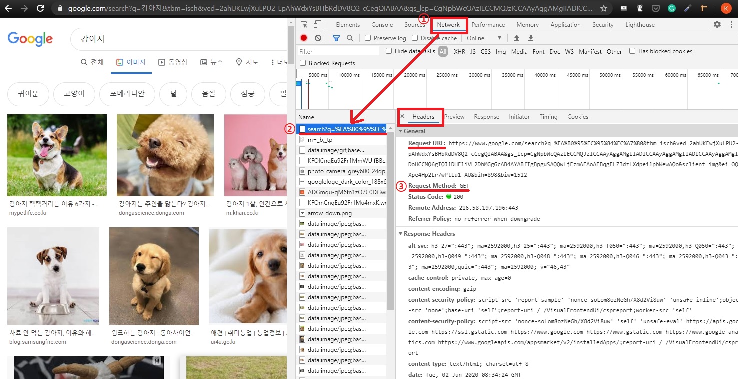 - Request Method 확인 = GET 방식임을 확인 할 수 있다.