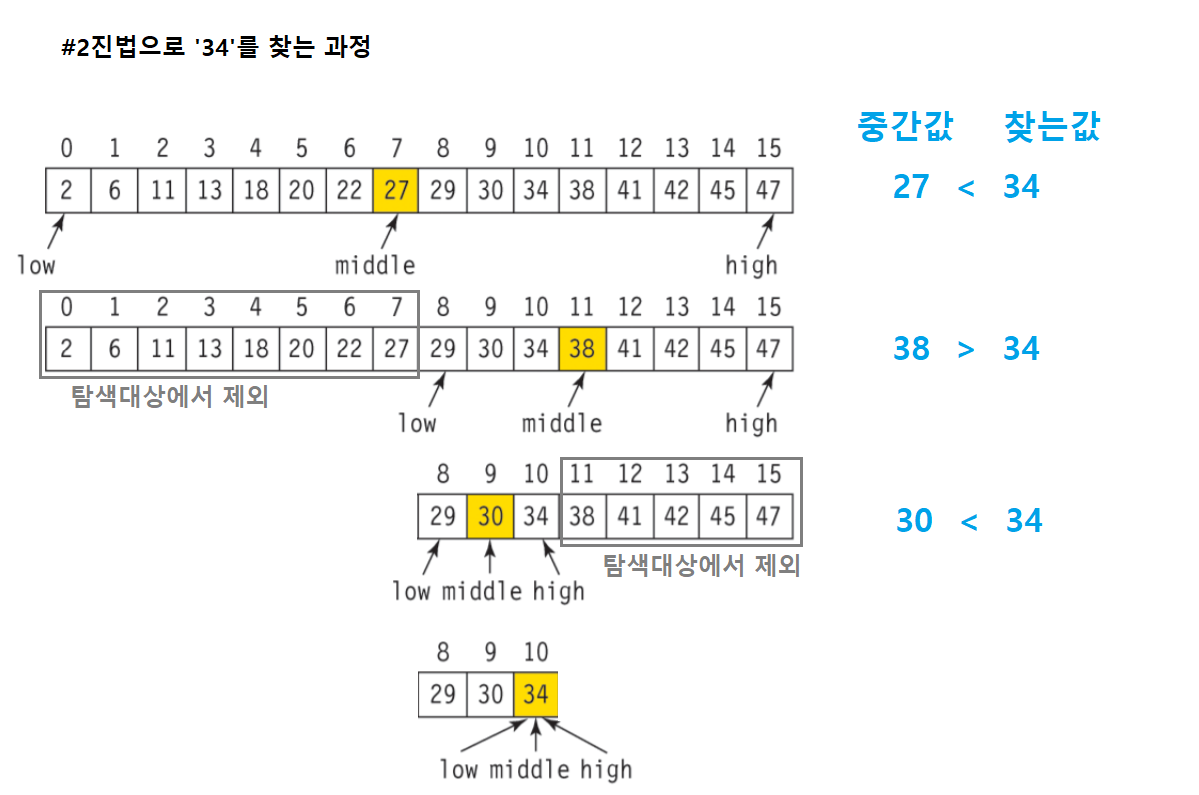 이진탐색 : 처음과 끝의 중간값을 목표와 비교하며 찾는 범위를 줄여나간다.