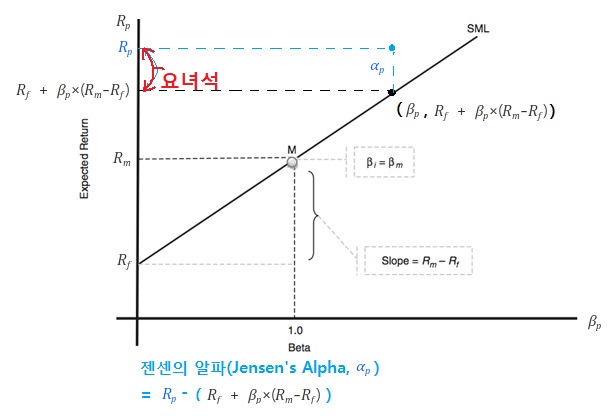 - 의미 : 위험자산A의 기대수익률[E(Ra)]과 위험자산A와 동일한 베타(β)로 구한 기대수익률의 차이
