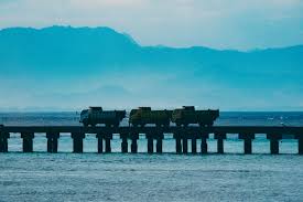 트럭 여러 대가 강을 가로지르는 일 차선 다리를 정해진 순으로 건너려 합니다.